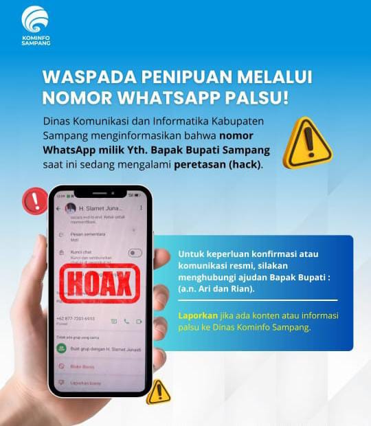 “Nomor WhatsApp Bapak Bupati saat ini sedang diretas. Untuk keperluan konfirmasi atau komunikasi resmi, silakan menghubungi ajudan Bapak Bupati, a.n. Ari dan Rian,” tulis Diskominfo dalam pengumumannya, Selasa (21/10/2025).