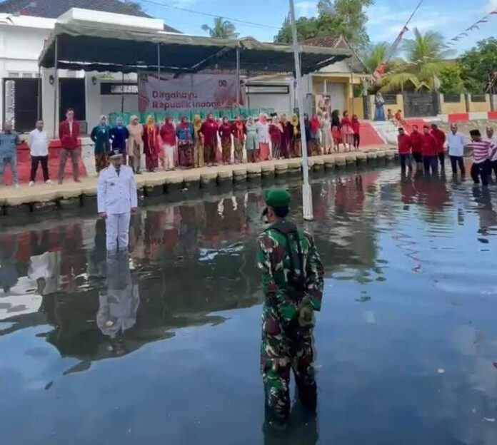 Upacara dimulai dengan pengibaran bendera Merah Putih di tengah sungai, diiringi lagu kebangsaan Indonesia Raya yang dinyanyikan dengan lantang oleh seluruh peserta. Meski kaki mereka terendam air, wajah-wajah penuh bangga dan haru tampak jelas dalam setiap gerakan baris-berbaris.